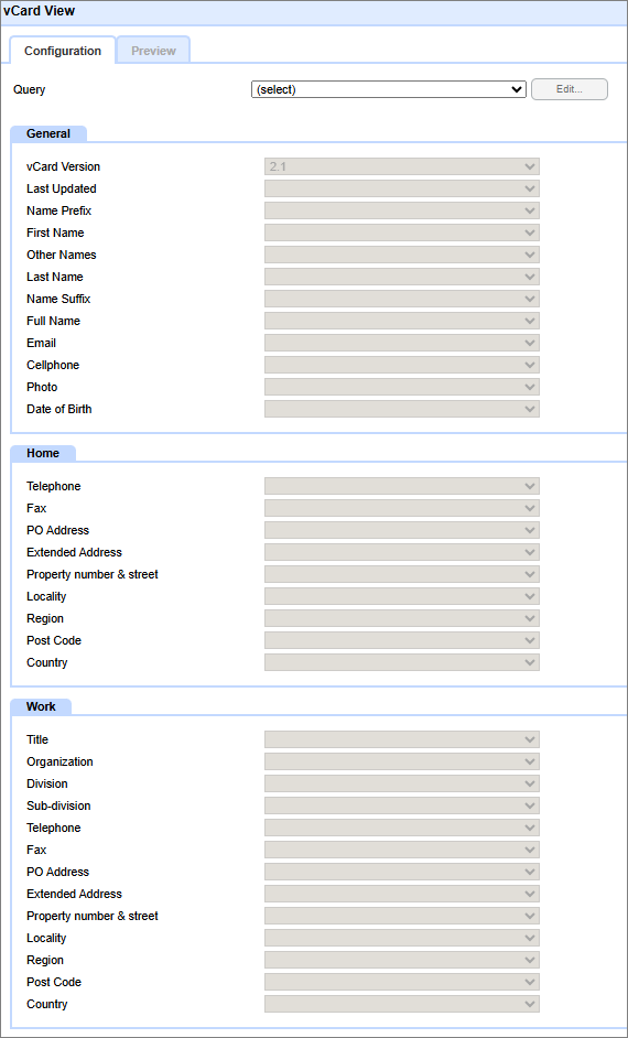 On the configuration panel, map the various fields in the Query to the vCard fields. (Not all fields are required)