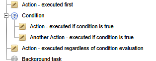 Objects within the event tree are executed in sequence from top to bottom. Child actions are shown indented in the event tree, and their execution is dependent on the evaluation of their parent condition.