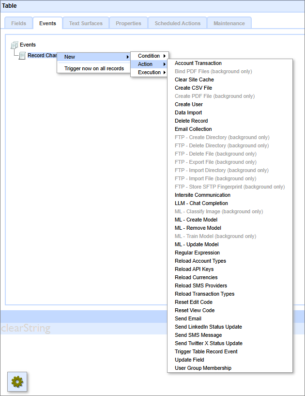 Actions are processes that are triggered by a Record Change Event on a Table component and are key to Process Automation.