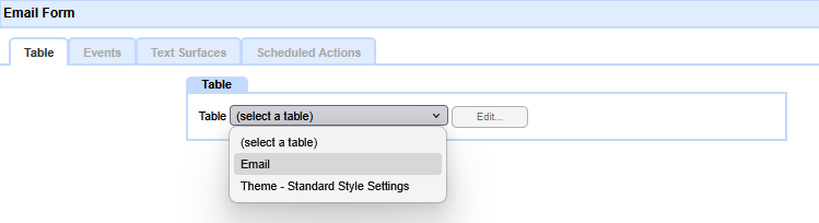 Then select the target table for the Data Entry Form. In this case use the 'Email' table you created earlier.