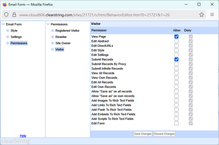Remember, you are currently logged in as the designer, however your visitors will not be logged in, so we need to give them permission to see the DEF and submit records.