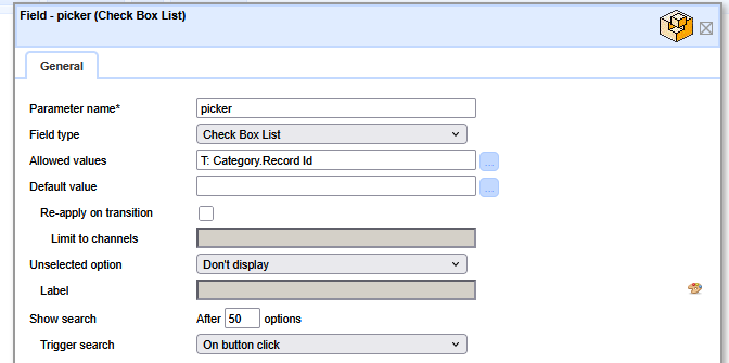 We are going to want to have a Check Box List as the way to select records. Next, set the Allowed values to be set to the Table Category previously created, with e Value set to Record Id and the Text to Category Name.