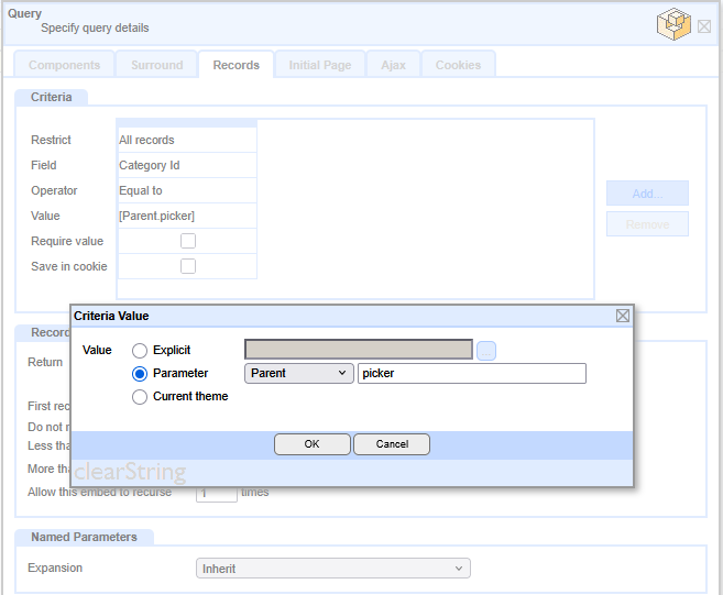 In the records tab, set the Criteria to Restrict All Records on Filed Category Id, where the Operator is Equal to the Value of a Parameter Parent with an explicit value of picker (the name we gave the QBE Parameter name previously).