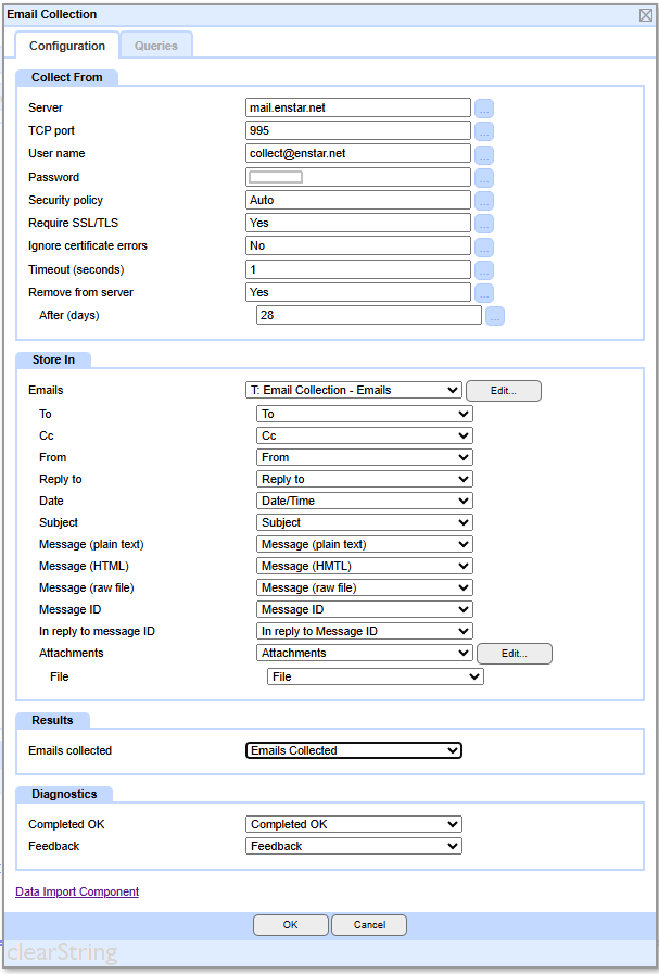 The Top Section allows you to define the email server and mailbox from which you are collecting the email