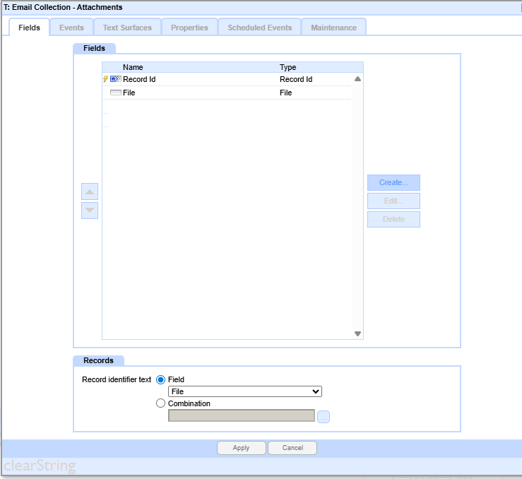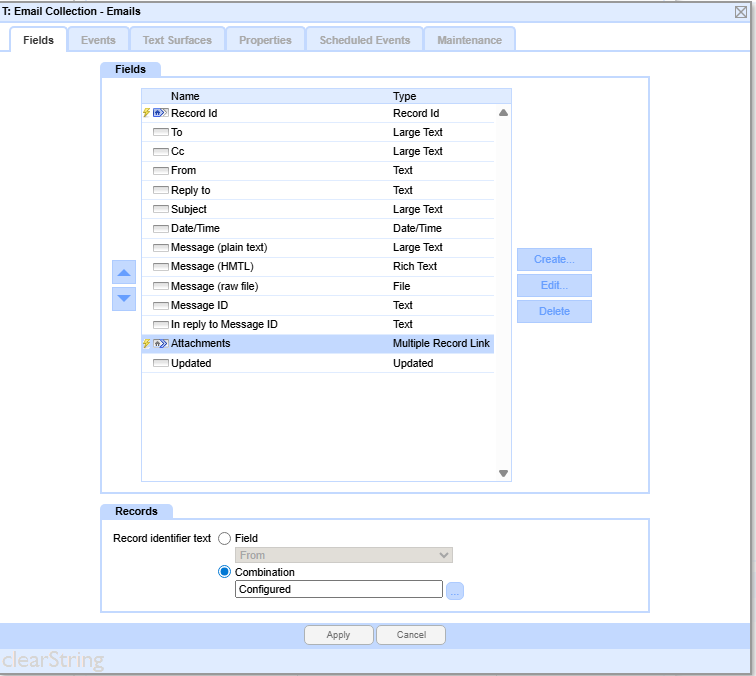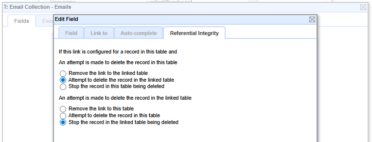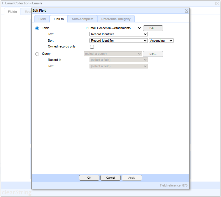 The Attachments field in the primary Email Collection table is set the Attachments table.