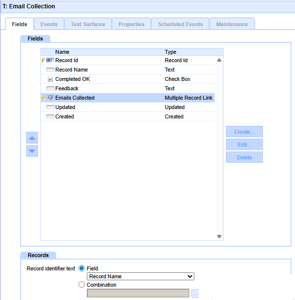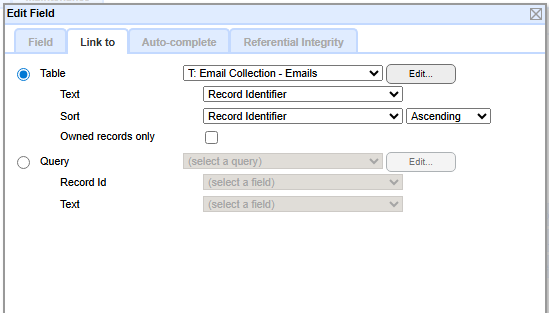 The Multiple Record Link is set to the third table - Email Collection - Attachments.