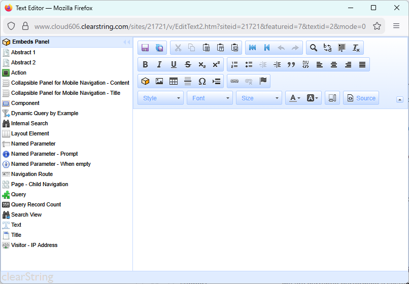 If you need more space you can close (and open) the left-side Embeds Panel using the chevron controls. You can also access the available embeds by using the special 'Embed Item' tool in the toolbar. Data components are context sensitive so the components you see may change depending on the components being configured.